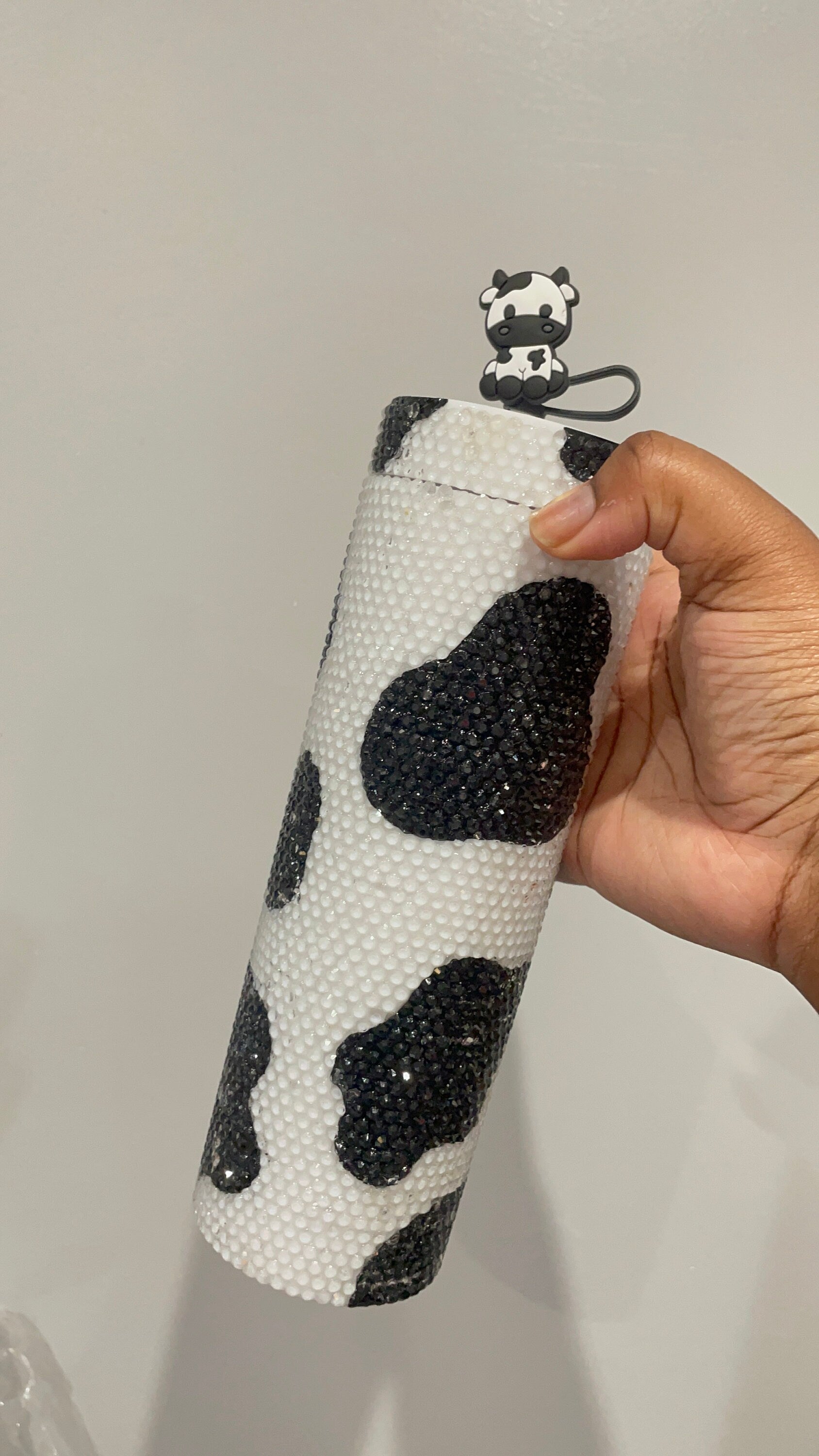 This is a double walled skinny tumbler with a cow print design and transparent rhinestones all over.